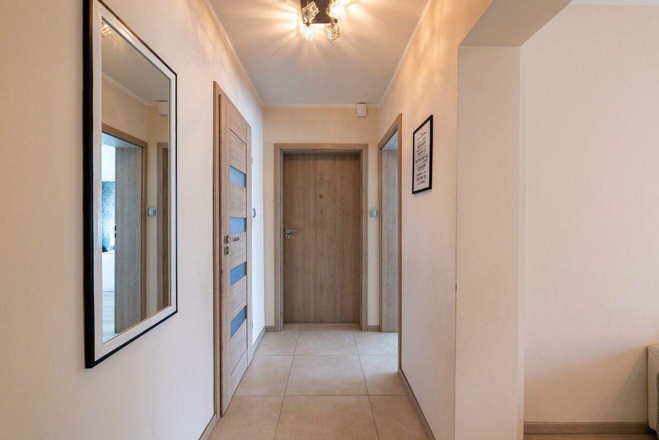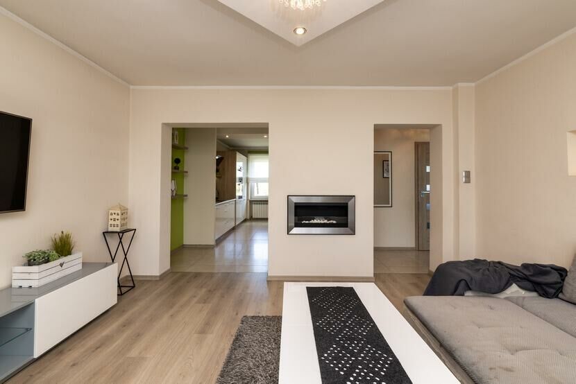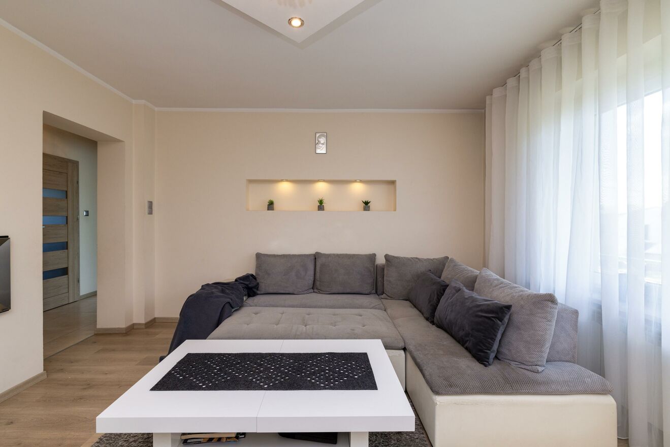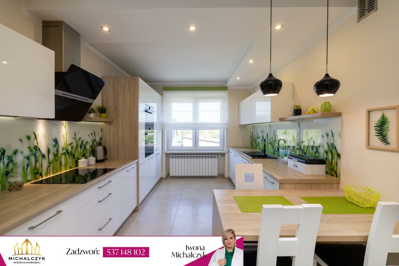 Nowocześnie i stylowo urządzone wnętrze - jasne barwy, elegancka zabudowa meblowa, kominek, gładzie gipsowe, panele, okna trzyszybowe. Kuchnia w pełni wyposażona, salon i jadalnia spójnie zaaranżowane z dbałością o każdy detal.