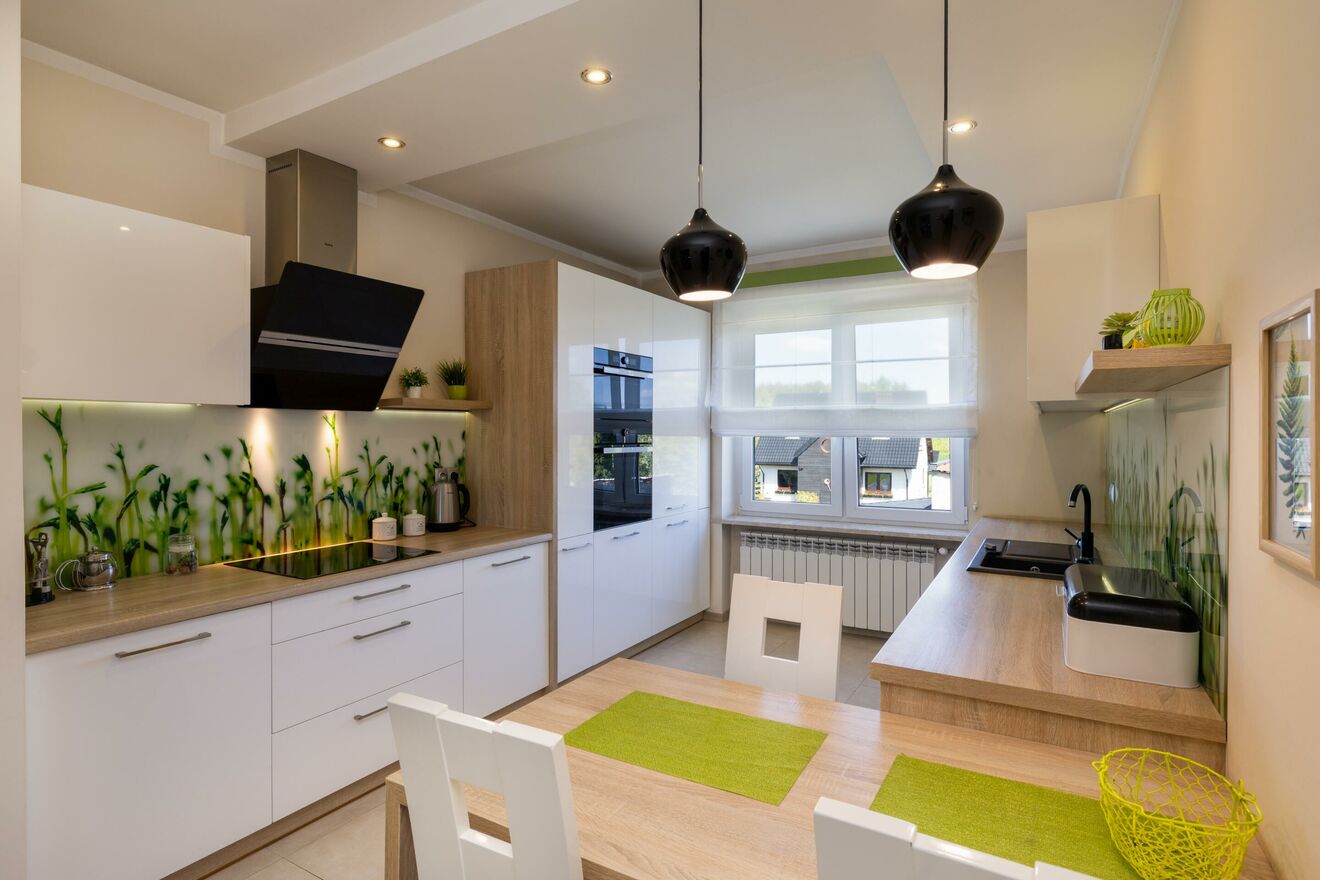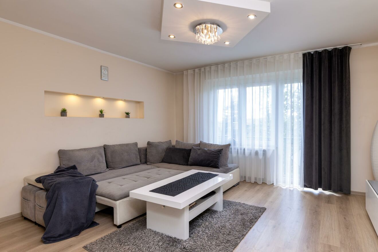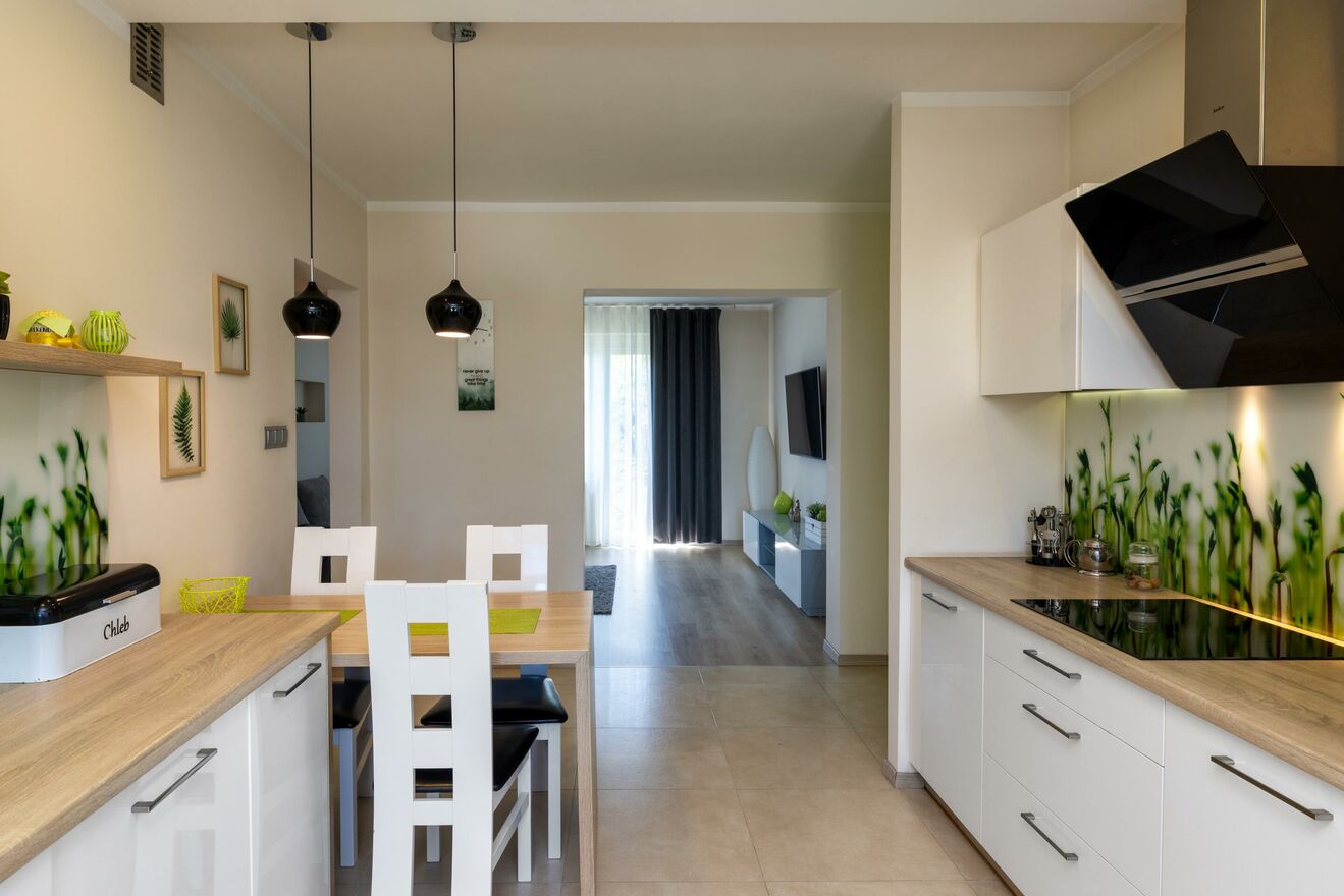 Nowocześnie i stylowo urządzone wnętrze - jasne barwy, elegancka zabudowa meblowa, kominek, gładzie gipsowe, panele, okna trzyszybowe. Kuchnia w pełni wyposażona, salon i jadalnia spójnie zaaranżowane z dbałością o każdy detal.